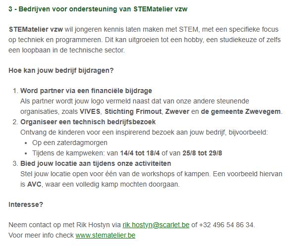 "Kinderen kunnen in hun vrije tijd kiezen voor sport, kunstacademie of ballet. Maar sommigen willen vooral met hun handen werken, dingen maken of uitvinden. Dat kan bij ons. Waar vroeger grootouders of een werkplaats zorgden voor die technische ontdekkingen, neemt het STEMatelier nu die rol over. We bouwen en programmeren met LEGO-technics, werken met hout, mechanica, elektronica, 3D-printen enzovoort."