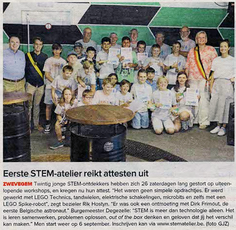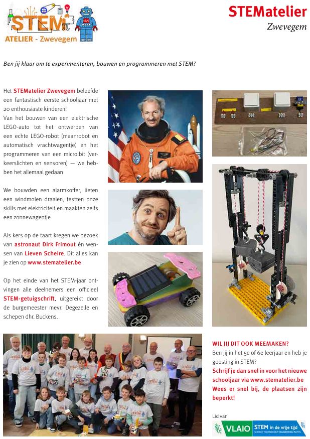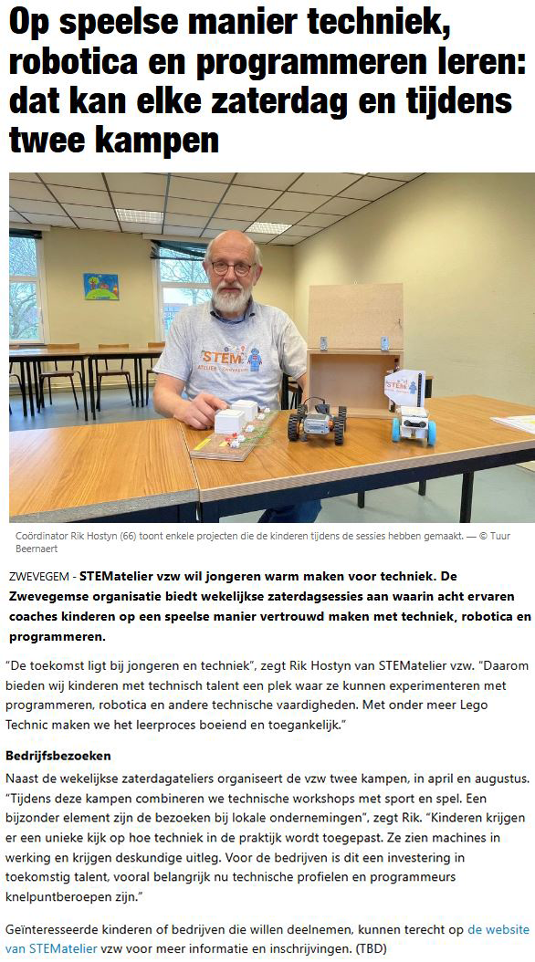 Sinds mijn pensioen blijft mijn passie voor STEM groot. Daarom ben ik in augustus 2024 gestart met het STEM-atelier Zwevegem: 29 sessies op zaterdagochtend en 2 weekkampen. Wij zijn uniek in Vlaanderen omdat kinderen een heel schooljaar met STEM bezig kunnen zijn (niet tijdens de vakantieperiodes). Het doel is jongeren in contact brengen met STEM; techniek en programmeren in het bijzonder. Het kan een hobby worden, voor anderen een studiekeuze of zelfs een latere loopbaankeuze."